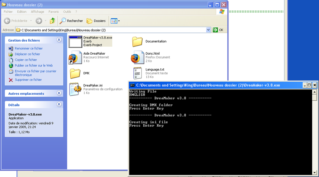 Don't worry, DMK works properly on Windows. We just try to make it working on Linux. Strange... it creates Language.txt and not DreaMaker.ini... Maybe because the files with .ini extension are removed by Linux, or something like that ? Or maybe it is automatically "insivisible", as some files on Windows ? Create a new file in this folder, and name it DreaMaker.ini. Just put this line in the file : Code: